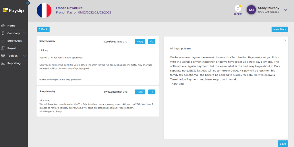 Notes are a great way to ask questions or share helpful payroll information with colleagues or ICPs. System users will receive an automated in-system alert when a note is waiting for them: they can immediately take quick and effective action and then add updated information to this note so that all stakeholders are kept aware of what is happening. Notes can be sent to multiple users quickly and you can also easily track notes history.